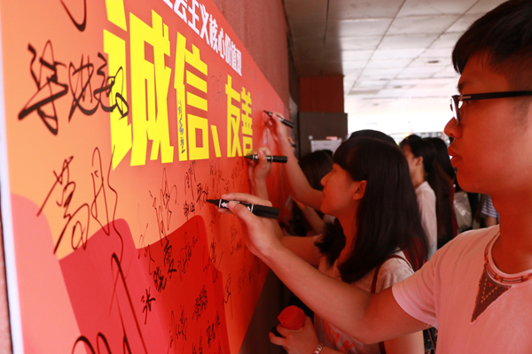 会议结束后,新生们在印有“诚信”、“友善”的展板上签上自己的名字,表达了自己践行社会主义核心价值观的决心和诚信待人、友善相处的意愿,正式开启了“臻美筑梦绘新篇”的广美学习之旅。